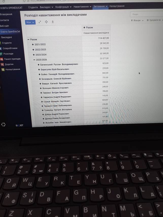 Так виглядає результат розподілу навантаження між викладачами в обсягах годин. Продукт дає змогу зберігати результати розподілу у попередніх навчальних роках. Ця функція є критично важливою для аналізу динаміки навантаження та планування на майбутнє.