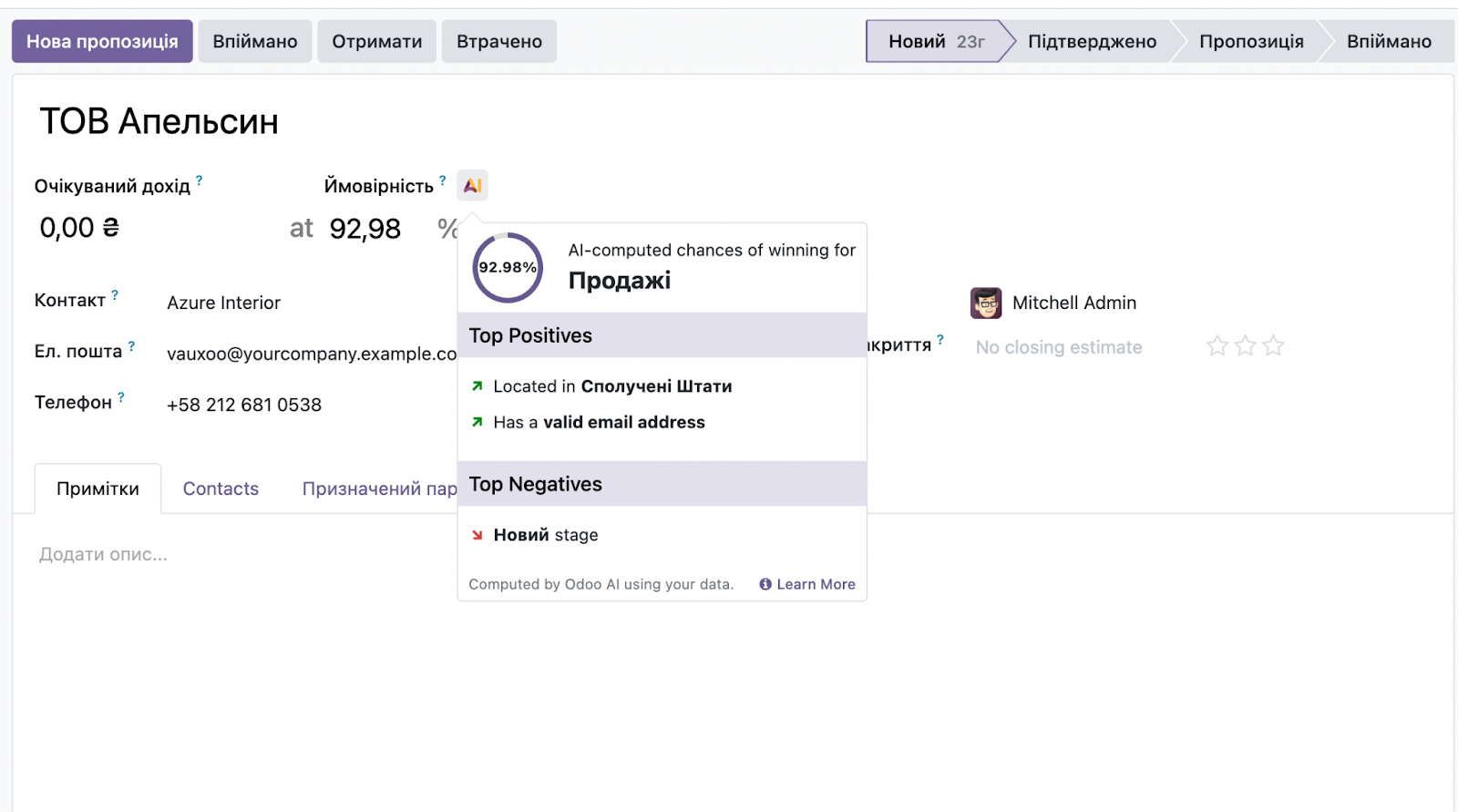 Також під час створення нового ліда можна одразу створити партнера, а за наявності IAP-сервісу, автоматично заповнити дані компанії (адресу, сайт, галузь), що зменшує ручну роботу.