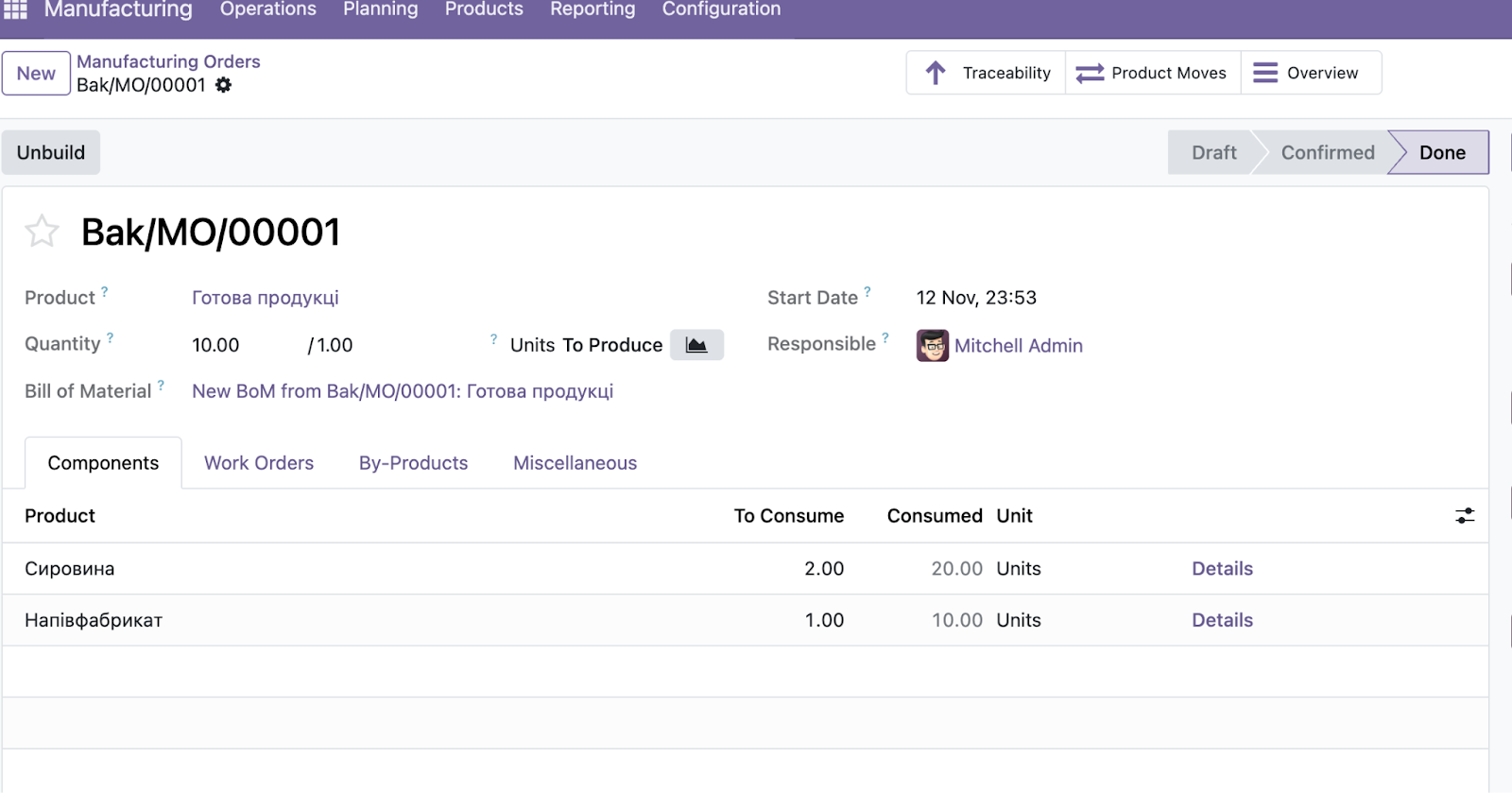 - Користувачі отримали оновлений інтерфейс із покращеними смарт-кнопками (Traceability, Product Moves, Overview) і більш зручну навігацію між вкладками Components, Work Orders та By-Products. Завдяки глибшій інтеграції з модулем Inventory тепер легше контролювати партії, упаковку та запаси.