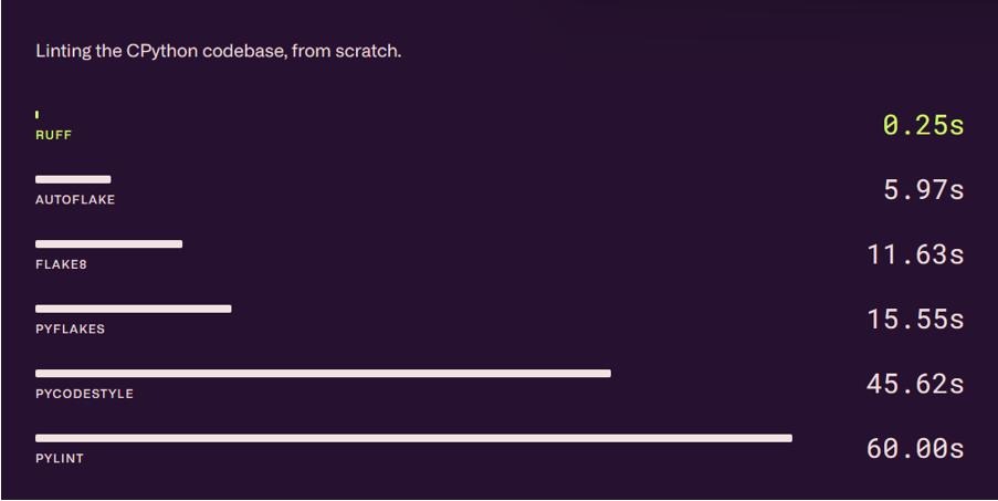 Швидкодія: Завдяки реалізації на Rust, Ruff працює в десятки, а іноді й у сотні разів швидше за традиційні Python-інструменти. Зворотний зв’язок надається практично миттєво навіть на великих проектах.