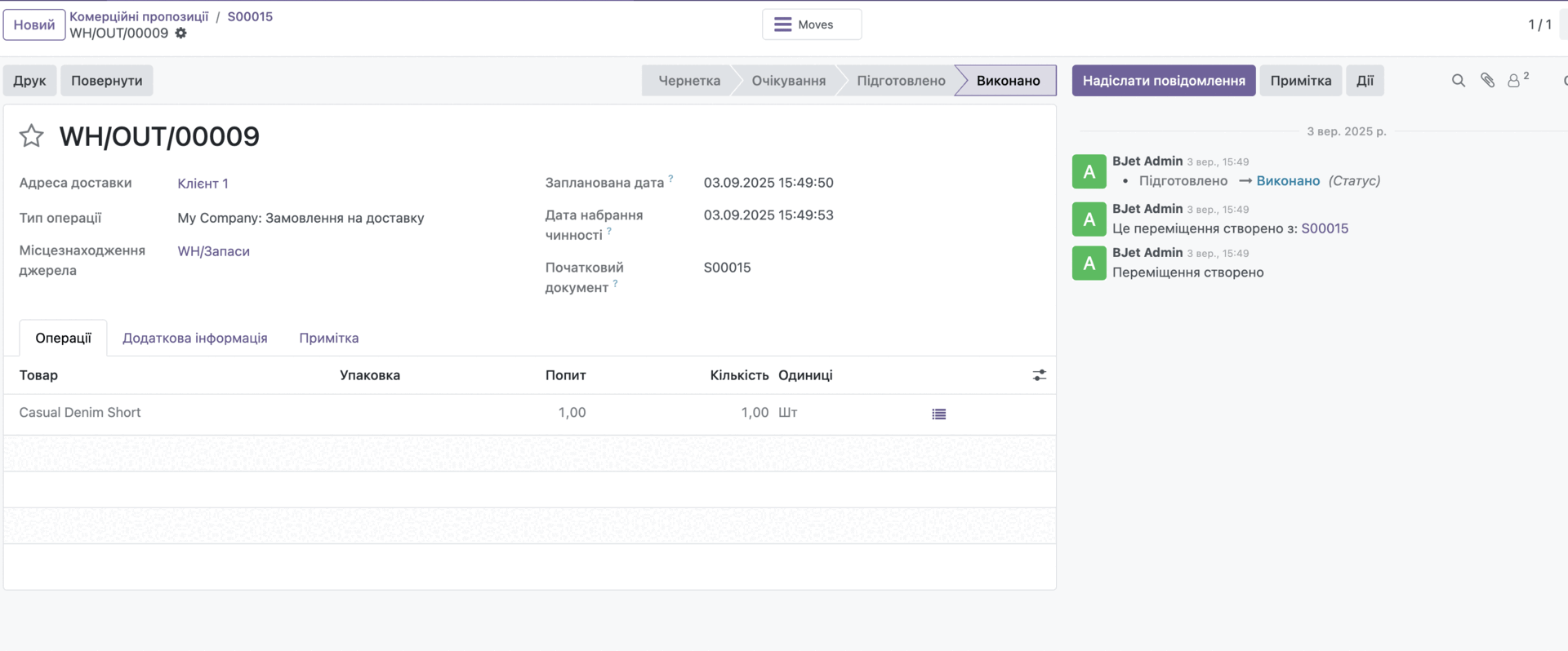 Клієнт оформлює замовлення через інтернет-магазин, система автоматично перевіряє наявність товарів, створює документи на відвантаження і формує завдання для служби доставки. Email з підтвердженням замовлення та номером накладної відправляється автоматично.