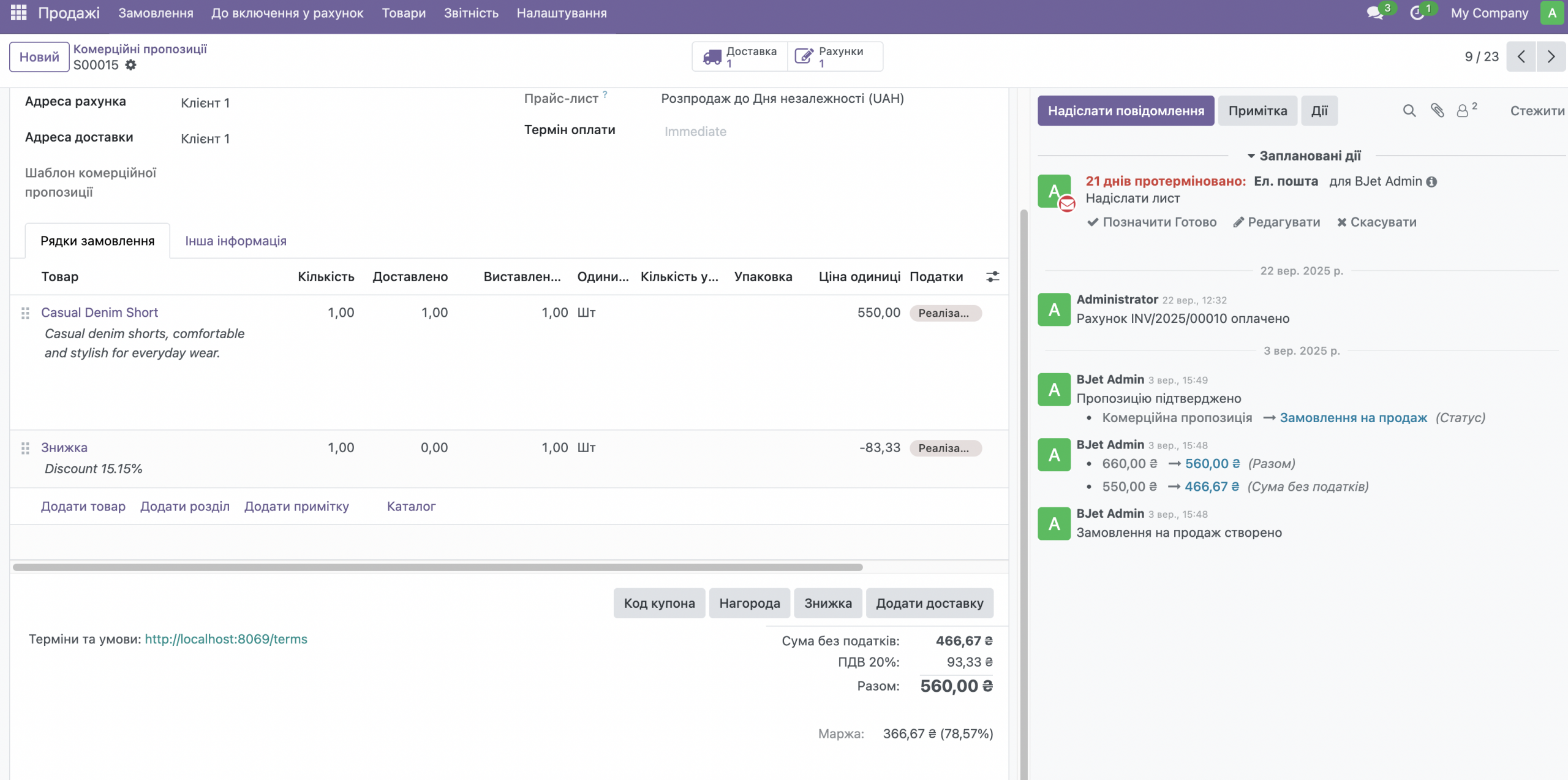 Менеджер створює замовлення для гуртового клієнта з індивідуальними цінами та знижками, система резервує товар на складі, формує документи на відвантаження та рахунки з різними термінами оплати. Можна налаштувати кредитні ліміти та автоматичні нагадування про заборгованість.
